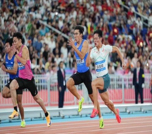 11月17日,男子100米决赛举行,广西队选手邓信锐(右一)与湖北队选手李泽洋(右二)在比赛中,湖北队选手李泽洋以10秒11的成绩夺冠。