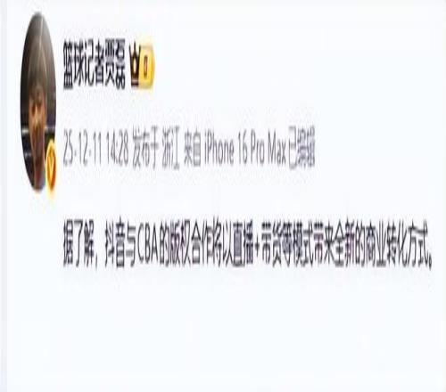 多家媒体和记者确认了这一重磅消息,直播吧独家报道:抖音获得新赛季CBA直播版权,将直播部分场次。看来一些不重的场次没有直播。篮球记者贾磊报道,“抖音与CBA的版权合作将以直播+带货等模式带来全新的商业转化方式。”