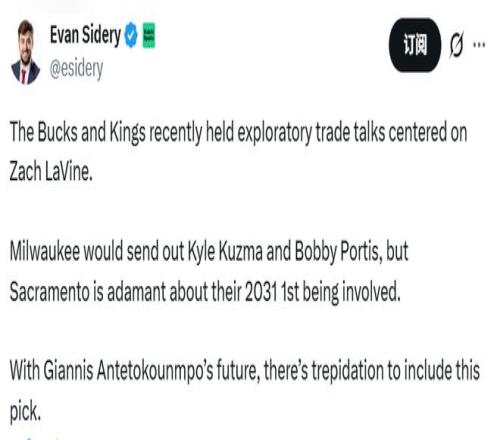在初步提出的交易框架中,雄鹿队计划将凯尔-库兹马与博比-波蒂斯送至国王队。不过有消息称,国王队立场强硬,坚持要求雄鹿队将2031年的首轮签纳入交易筹码。考虑到字母哥的长期去向尚未明朗,雄鹿队对于送出这个选秀权一事十分犹豫。