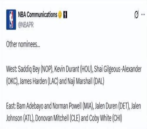 西部:萨迪克-贝(鹈鹕)、杜兰特(火箭)、亚历山大(雷霆)、哈登(快船)、马绍尔(独行侠)